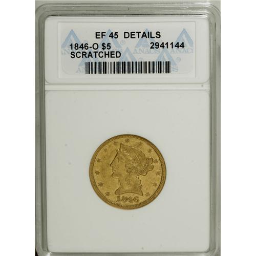 <B>1846-O $5 --Scratched--ANACS. XF45 Details.</B></I> A vertical pinscratch is noted between the jaw and the 1 in the date, and the reverse field has a pair of less important thin marks. Sharply defined for the XF45 Details grade.<BR><BR><b>Shipping:</b> Coins & Currency (<a target="_blank" href="http://www.heritageauctions.com/common/shipping.php">view shipping information</a>)