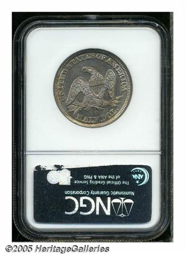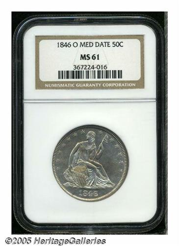 <B>1846-O<50C> Medium Date MS61 NGC.</B></I> WB-105. The 6 in the date is recut within the loop. The Wiley-Bugert reference lists WB-105 as Low R.8 in Mint State. This partial drapery example displays attractive peach and lilac hues. Nicely struck and relatively unmarked for the grade.