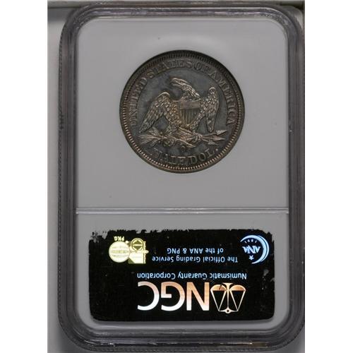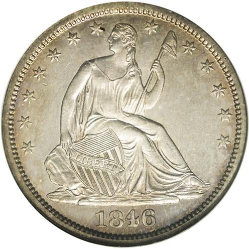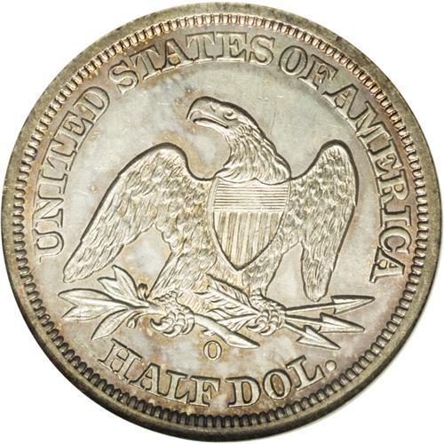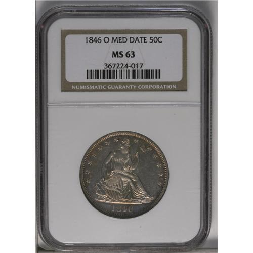 <B>1846-O<50C> Medium Date MS63 NGC.</B></I> WB-103. The base of the 1 is repunched. Although the 1846-O Medium Date is more available than its Tall Date counterpart, the variety is nonetheless rare in Uncirculated grades. This razor-sharp representative is attractively toned orange and cream-gray, and marks of individual consequence are not detected. Census: 2 in 63, 1 finer (6/06).