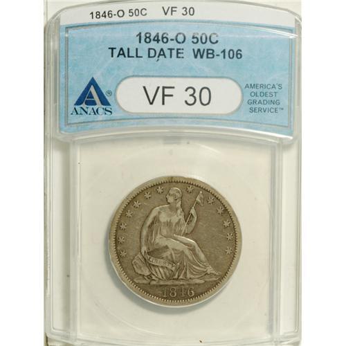 <B>1846-O 50C Tall Date VF30 ANACS.</B></I> A moderately worn tan-gray and slate-gray example of this interesting half dollar variety. The obverse has a number of handling marks in the fields, though the reverse is comparatively clean.<BR><BR><b>Shipping:</b> Coins & Currency (<a target="_blank" href="http://www.heritageauctions.com/common/shipping.php">view shipping information</a>)
