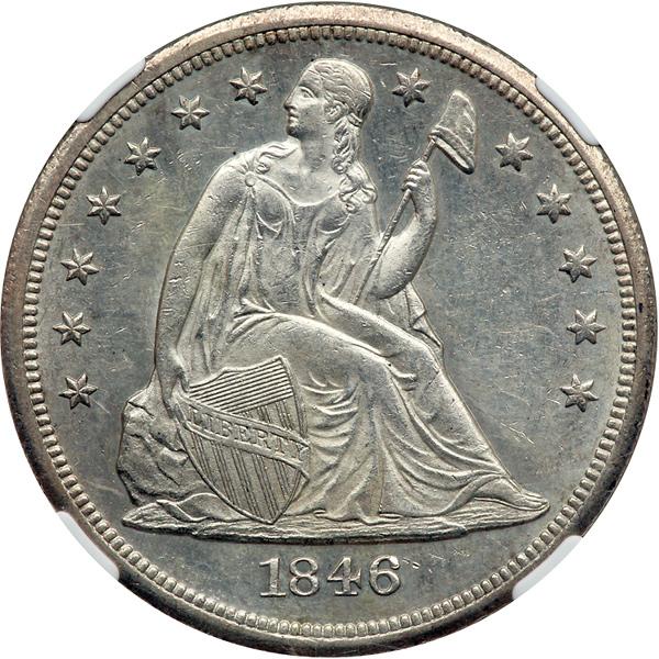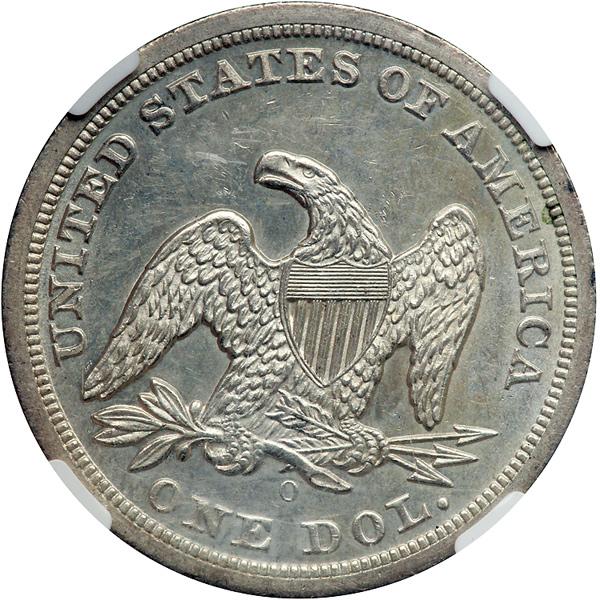 1846-O Liberty Seated Dollar. NGC graded MS-61. A hint of light tone with semi-reflective fields. Only 59,000 struck. Blessedly original, the example in this lot displays the light silver-gray surfaces and luster one associates with Mint condition '46-O Dollars. Both sides are awash in originality, with a few stray bagmarks in line with the MS61 grade. The strike is well above average in being sharp; the emerging detail over Liberty's head on the obverse is what one likes to see. The surfaces may have secured an even finer grade were the luster a little brighter. Pop 5; 11 finer, 9 in 62, 1 in 63, 1 in 65.