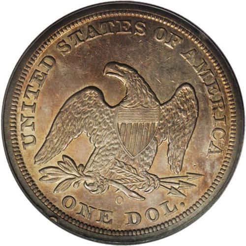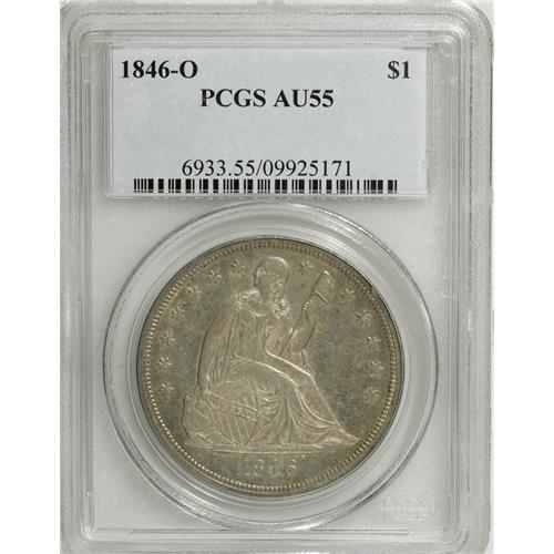 <B>1846-O S$1 AU55 PCGS.</B></I> Peach and plum-mauve toning embraces this partly lustrous and nicely struck example. Small rim nicks are present at 2 o'clock on the obverse and 7:30 on the reverse, and the fields have a few thin marks. The 1846-O is the introductory New Orleans silver dollar, and is very scarce in AU. Population: 16 in 55, 32 finer (3/07).<BR><BR><b>Shipping:</b> Coins & Currency (<a target="_blank" href="http://www.heritageauctions.com/common/shipping.php">view shipping information</a>)
