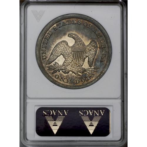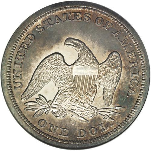 <B>1846-O<img border='0' src='http://www.heritagecoins.com/images/star.gif' width=10 height=10>$1> MS61 ANACS.</B></I> The 1846-O is the first branch mint Seated dollar and is scarce above XF condition. Speculation seems to have gotten the best of Q. David Bowers when he romanticized this issue in his 1993 silver dollar <I>Encyclopedia:</B></I> "I suspect that this issue circulated widely and saw use in the channels of commerce up and down the Mississippi River Valley, especially riverboats (which numbered in the hundreds) and casinos." The 1846-O certainly was circulated extensively, as seen by the paucity of Mint State survivors, but as for riverboats and casinos, well...<BR> This piece is well, but not fully struck with just a bit of softness on the stars and Liberty's head. The surfaces are bright with an overlay of smoky gray and brown toning with an intermittent dash of deep blue. Lightly abraded. <BR><BR><B>Important notice:</B> Heritage usually auctions material at the rate of 200-250 lots per hour. On some occasions eBay Live bid software or the Internet may not be able to keep up with the pace of the auction. We recommend placing a realistic absentee bid now as insurance to avoid disappointment. Occasionally the auctioneer may eliminate or reject an eBay Live bid, and the auctioneer may also reopen a lot after the close of the eBay live bidding (usually because we missed an audience bid), and may reject your bid even if it shows you as the winning bidder. By bidding via eBay Live, you agree that Heritage may award the lot to another bidder at its sole discretion under the circumstances described above or any other reasonable circumstances. Since eBay bids are not shown to us until we open the lot on the floor, we treat those bids just like floor bids. In most cases the floor responds before the eBay bid is presented to us, due to Internet lag time, so for consistency we have made it a policy that floor bids are always considered first over tie eBay live bids. Also please note that all Heritage lots purchased through eBay Live carry a 20% Buyer's Premium. Please make sure you read the Terms and Conditions before you bid. This lot is being auctioned in conjunction with a live floor auction by Heritage Galleries & Auctioneers. All final auction and invoice information will be supplied by Heritage Galleries & Auctioneers, and all other information should be considered preliminary. Lot:2172 <BR><BR><B>Winning Notification and Billing:</B> After the FINAL session in this auction is complete, Heritage will send e-mail and snail mail invoices. This process normally takes several days. All final auction and invoice information will be supplied by Heritage Galleries & Auctioneers, and all other information should be considered preliminary. <BR><BR>This auction will be conducted on a live auction floor and over the Internet through eBay Live. If you choose to place an absentee bid, please take a moment to <font color='#0000ff'><u><a href='http://pages.ebay.com/liveauctions/help/before/laabsentee.html'>learn how eBay Live absentee bidding works</a></u></font><font color='#000000'>