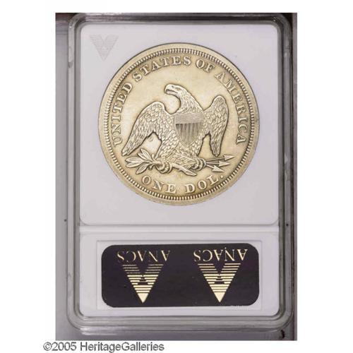 <B>1846-O<S$1>--Repaired, Cleaned--ANACS. AU Details.</B></I> This scarce New Orleans Dollar has light apricot color and only slight highpoint wear, but the fields are minutely granular, and unnaturally smooth and prooflike. A spot beneath the left (facing) wing is pinscratched.