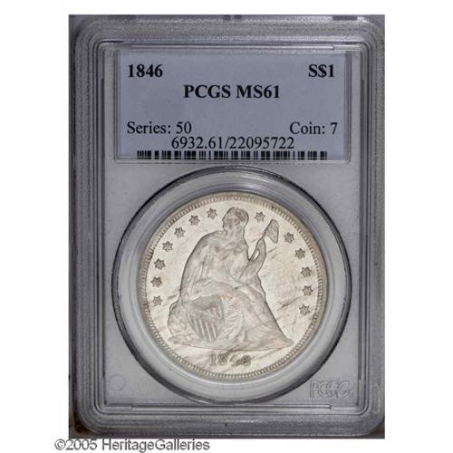 1846 S$1 MS61 PCGS. Lustrous, with some prooflike tend 1846[S$1] MS61 PCGS.