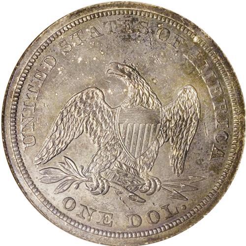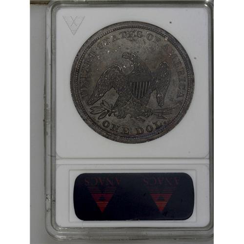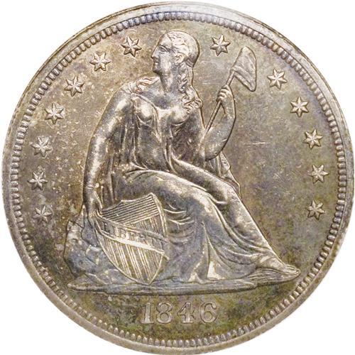 <B>1846<img border='0' src='http://www.heritagecoins.com/images/star.gif' width=10 height=10>$1> PR55 ANACS.</B></I> Breen-5436, Recut Date. Prior to 1858, proofs were not coined with any regularity or with any real plan for distribution, and this dollar was probably struck at the request of one of the few collectors of the time or as a presentation piece for some contemporary VIP. The 1846 proof silver dollar is a true rarity. Bowers estimates only 30-40 were coined, with 15 or so that can be traced today. The mirrored fields on this piece are quite muted due to having been in circulation for a short time and depth of the charcoal-gray toning that has accumulated over the years. Lightly hairlined, several small marks and abrasions from rough handling are noted in the fields on each side. However, these small impairments should not deter a strong bid for this exceedingly rare piece.