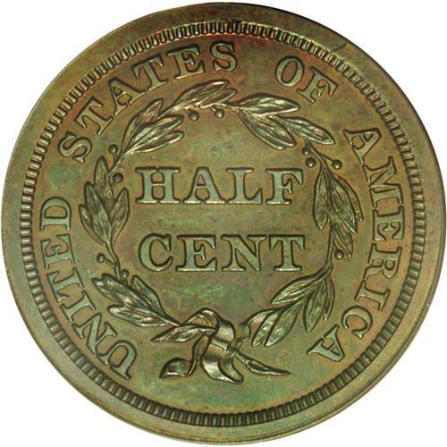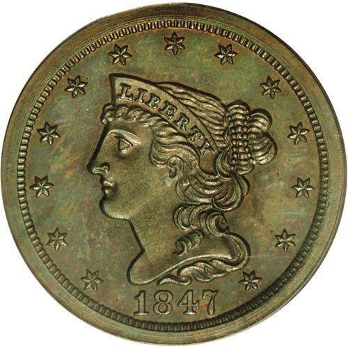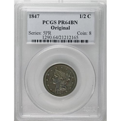 <B>1847 1/2 C Original PR64 Brown PCGS.</B></I> B-1, R.6. Medium date; Large berries. The obverse has a moderate-sized date, larger than in previous years yet considerably smaller than 1848. The wide obverse border has distinctive concentric lathe lines, seen also on the Restrikes of this date, but not seen on any other obverse dies in the Proof-only series. Sharply struck and free of troublesome hairlines or contact marks. Mostly sea-green and purple-rose on each side. EAC PR60. Population: 4 in 64, 0 finer (11/06).<BR><BR><b>Shipping:</b> Coin/Currency (<a target="_blank" href="http://www.heritageauctions.com/common/shipping.php">view shipping information</a>)