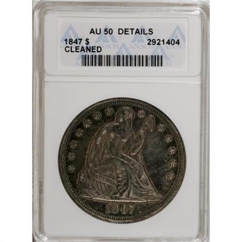 <B>1847 $1 --Cleaned--ANACS .AU50 Details.</B></I> NGC Census: (26/209). PCGS Population (58/186). Mintage: 140,750. Numismedia Wsl. Price for NGC/PCGS coin in AU50: $610. (#6934)<BR><BR><B>Coin Engraver:</B> Christian Gobrecht<BR><BR><b>Shipping:</b> Coins & Currency (<a target="_blank" href="http://www.heritageauctions.com/common/shipping.php">view shipping information</a>)