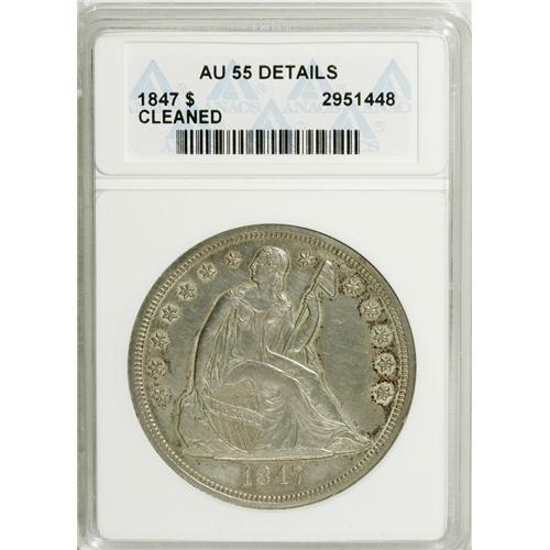 <B>1847 $1 --Cleaned--ANACS. AU55 Details.</B></I> NGC Census: (45/132). PCGS Population (69/76). Mintage: 140,750. Numismedia Wsl. Price: $700. (#6934)<BR><BR><b>Shipping:</b> Coins & Currency (<a target="_blank" href="http://www.heritageauctions.com/common/shipping.php">view shipping information</a>)
