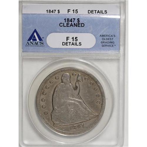 <B>1847 $1 --Cleaned--ANACS. F15 Details.</B></I> NGC Census: (1/300). PCGS Population (2/376). Mintage: 140,750. Numismedia Wsl. Price for NGC/PCGS coin in F15: $239. (#6934)<BR><BR><B>Coin Engraver:</B> Christian Gobrecht<BR><BR><b>Shipping:</b> Coins & Currency (<a target="_blank" href="http://www.heritageauctions.com/common/shipping.php">view shipping information</a>)