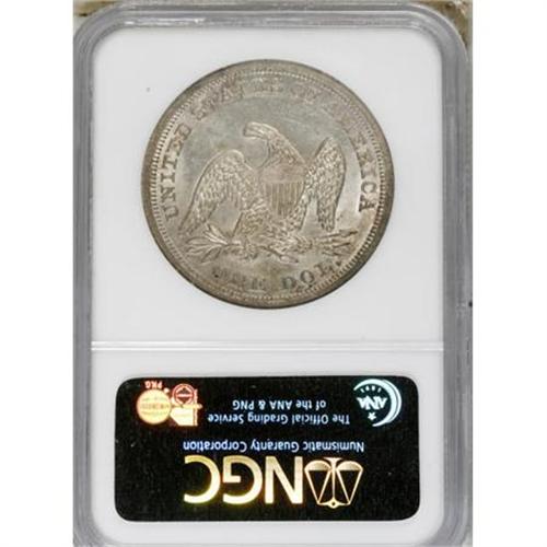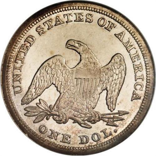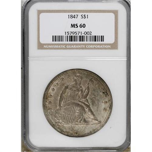 <B>1847 $1 MS60 NGC.</B></I> Subdued luster is still present under a moderately thick layer of toning in shades of steel-gray, lilac, and ice-blue. A few scattered contact marks are present, but none are overly severe, and this piece remains an attractive coin despite the perhaps harsh grade. Census: 2 in 60, 59 finer (1/08).<BR><BR><B>Coin Engraver:</B> Christian Gobrecht<BR><BR><b>Shipping:</b> Coins & Currency (<a target="_blank" href="http://www.heritageauctions.com/common/shipping.php">view shipping information</a>)