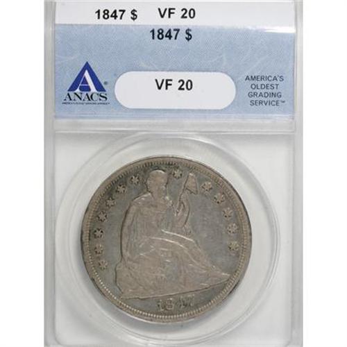 <B>1847 $1 VF20 ANACS.</B></I> NGC Census: (3/300). PCGS Population (2/378). Mintage: 140,750. Numismedia Wsl. Price for NGC/PCGS coin in VF20: $279. (#6934)<BR><BR><B>Coin Engraver:</B> Christian Gobrecht<BR><BR><b>Shipping:</b> Coins & Currency (<a target="_blank" href="http://www.heritageauctions.com/common/shipping.php">view shipping information</a>)