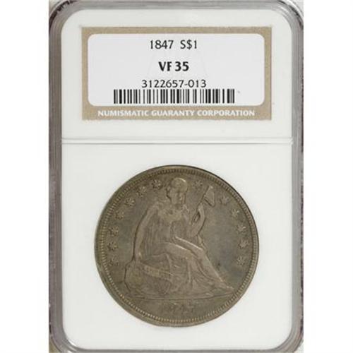 <B>1847 $1 VF35 NGC.</B></I> . NGC Census: (4/288). PCGS Population (22/335). Mintage: 140,750. Numismedia Wsl. Price for NGC/PCGS coin in VF35: $342. (#6934)<BR><BR><B>Coin Engraver:</B> Christian Gobrecht<BR><BR><b>Shipping:</b> Coins & Currency (<a target="_blank" href="http://www.heritageauctions.com/common/shipping.php">view shipping information</a>)
