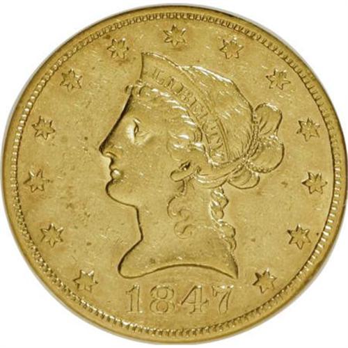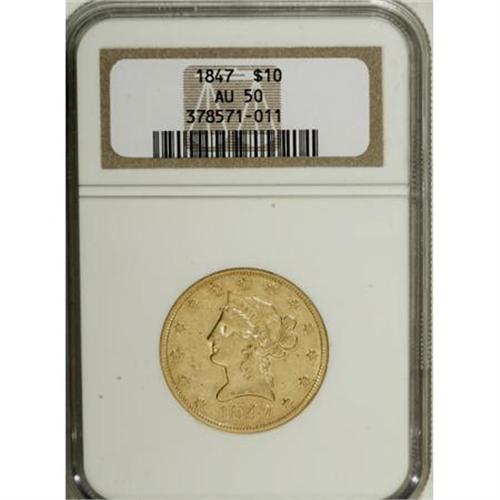 1847 $10 AU50 NGC. NGC Census: (104/384). PCGS Pop