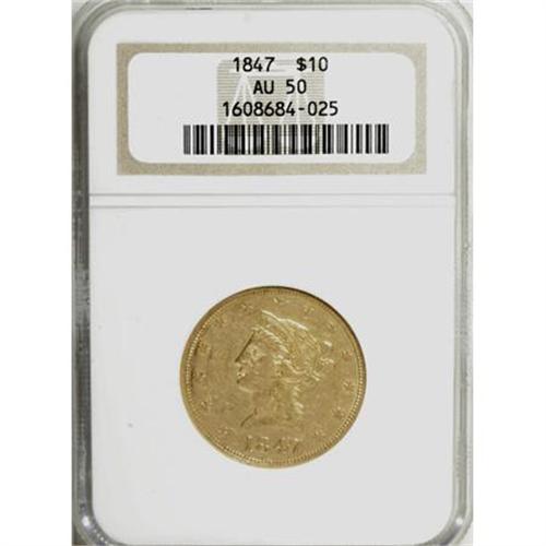 <B>1847 $10 AU50 NGC.</B></I> NGC Census: (104/426). PCGS Population (74/124). Mintage: 862,258. Numismedia Wsl. Price for NGC/PCGS coin in AU50: $440. (#8597)<BR><BR><B>Coin Engraver:</B> Christian Gobrecht<BR><BR><b>Shipping:</b> Coins & Currency (<a target="_blank" href="http://www.heritageauctions.com/common/shipping.php">view shipping information</a>)