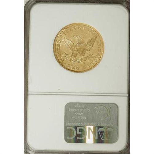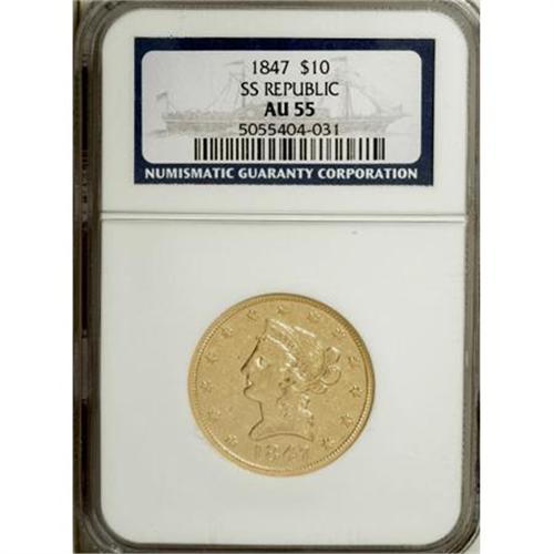 <B>1847 $10 AU55 NGC.</B></I> Ex: <I>S.S. Republic</B></I>. This pale yellow-gold piece retains strong peripheral luster. Well struck with a touch of wear on the central devices and light, scattered abrasions in the fields.<BR><BR><B>Coin Engraver:</B> Christian Gobrecht<BR><BR><b>Shipping:</b> Coins & Currency (<a target="_blank" href="http://www.heritageauctions.com/common/shipping.php">view shipping information</a>)