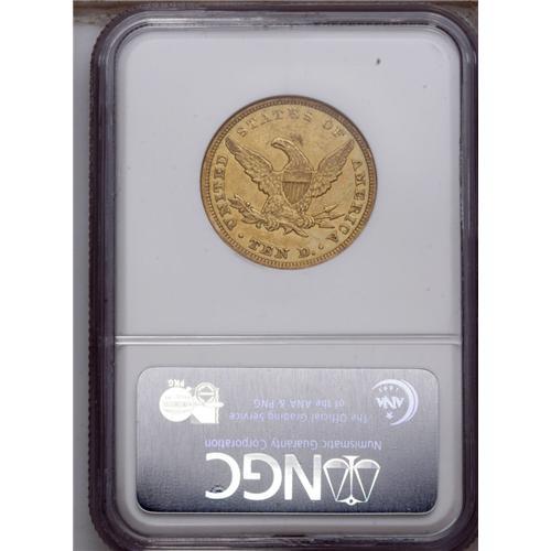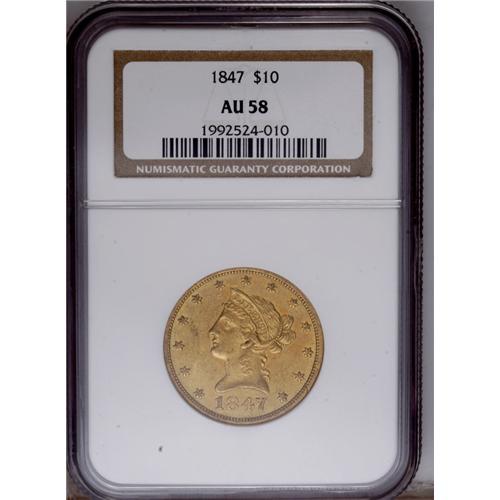 <B>1847<$10> AU58 NGC.</B></I> A splendidly detailed piece with minor reverse rim marks at 2 and 8 o'clock. The 1 and 7 have higher relief than the 84 in the date, leading to speculation from some numismatists that the date logotype was rocked into the die. From the bulging bun obverse hub.