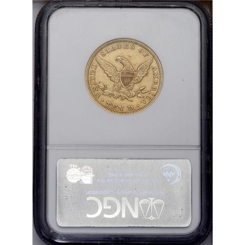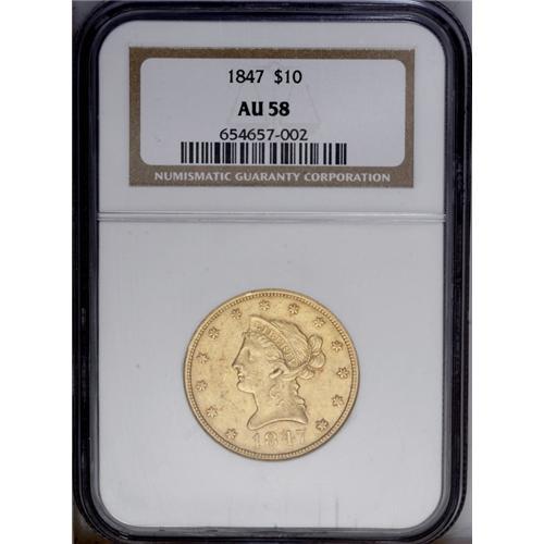 <B>1847 $10 AU58 NGC.</B></I> Luster remains around the protected devices and faint copper stains are seen on both sides when closely inspected. The reverse is attractive for the grade with few marks of significance, while the obverse shows one noticeable contact mark on Liberty's cheek and several smaller marks in the left obverse field. A tough issue in all degrees of Mint State.