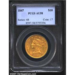 1847 $10 AU58 PCGS.<p>Rich, satiny luster and a bold strike compliment each side of this near-Mint example. Only close examination reveals the slightest rubbing on the highpoints. Important notice: We expect to be auctioning lots at the rate of 200-250 per hour. Sometimes eBay Premier live bid software cannot keep up with that pace, so we strongly recommend that you place a realistic proxy bid now as insurance to avoid disappointment. Also please note that all Heritage/CAA lots purchased through eBay Premier carry a 20% Buyer's Premium.