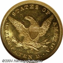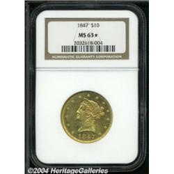 <B>1847<$10> MS63<S NGC.</B></I> With an original mintage of 862,258 pieces, the 1847 eagle is not a scarce date and is relatively easy to obtain in VF and XF grades. It is, however, an important condition rarity in Mint State grades. This example is well struck throughout, save for minor softness on one or two stars on the lower right obverse border. The surfaces reveal a bright apricot-gold coloration and are for the most part only lightly abraded. A small mark in the field beneath the eagle's beak is mentioned for accuracy, and might well serve as a pedigree identifier. The reverse fields show relatively strong die polish lines (as struck) which help to bring about nearly prooflike conditions. Population: 3 in 63, 0 finer (5/04). <BR><BR><B>Important notice:</B> Heritage usually auctions material at the rate of 200-250 lots per hour. On some occasions eBay Live bid software or the Internet may not be able to keep up with the pace of the auction. We recommend placing a realistic absentee bid now as insurance to avoid disappointment. Occasionally the auctioneer may eliminate or reject an eBay Live bid, and the auctioneer may also reopen a lot after the close of the eBay live bidding (usually because we missed an audience bid), and may reject your bid even if it shows you as the winning bidder. By bidding via eBay Live, you agree that Heritage may award the lot to another bidder at its sole discretion under the circumstances described above or any other reasonable circumstances. Since eBay bids are not shown to us until we open the lot on the floor, we treat those bids just like floor bids. In most cases the floor responds before the eBay bid is presented to us, due to Internet lag time, so for consistency we have made it a policy that floor bids are always considered first over tie eBay live bids. Also please note that all Heritage lots purchased through eBay Live carry a 20% Buyer's Premium. Please make sure you read the Terms and Conditions before you bid. </span></font></tr></table></td></tr></table>