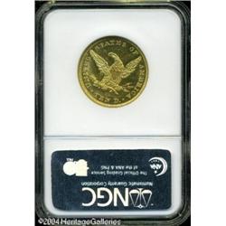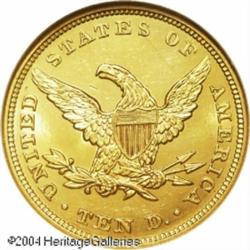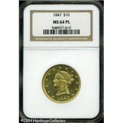 1847 $10 MS64 Prooflike NGC. With 862,258 coins pr <B>1847 $10 MS64 Prooflike NGC.</B></I> With 862,258 coins produced, the 1847 is a plentiful No Motto ten dollar. However, even it is scarce in MS64 condition with this piece being the finest certified by NGC (11/04). Its specialness is further reinforced by the bright, sparkling prooflike fields on each side, a most unusual and attractive attribute for gold coins of this period. Well, but not quite fully struck, the surfaces are lightly abraded with the only mentionable mark located between the eagle's beak and the left (facing) wing. <BR><BR><B>Important notice:</B> Heritage usually auctions material at the rate of 200-250 lots per hour. On some occasions eBay Live bid software or the Internet may not be able to keep up with the pace of the auction. We recommend placing a realistic absentee bid now as insurance to avoid disappointment. Occasionally the auctioneer may eliminate or reject an eBay Live bid, and the auctioneer may also reopen a lot after the close of the eBay live bidding (usually because we missed an audience bid), and may reject your bid even if it shows you as the winning bidder. By bidding via eBay Live, you agree that Heritage may award the lot to another bidder at its sole discretion under the circumstances described above or any other reasonable circumstances. Since eBay bids are not shown to us until we open the lot on the floor, we treat those bids just like floor bids. In most cases the floor responds before the eBay bid is presented to us, due to Internet lag time, so for consistency we have made it a policy that floor bids are always considered first over tie eBay live bids. Also please note that all Heritage lots purchased through eBay Live carry a 20% Buyer's Premium. Please make sure you read the Terms and Conditions before you bid. This lot is being auctioned in conjunction with a live floor auction by Heritage Galleries & Auctioneers. All final auction and invoice information will be supplied by Heritage Galleries & Auctioneers, and all other information should be considered preliminary. Lot:6728