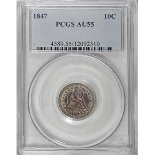<B>1847 10C AU55 PCGS.</B></I> Steel-gray surfaces show hints of golden color at the peripheries and a bit of luster, as well. A surprisingly scarce, though often overlooked date. Tall or large date with the tops of each digit joined to the base of Liberty.<BR><BR><B>Coin Engraver:</B> Christian Gobrecht<BR><BR><b>Shipping:</b> Coins & Currency (<a target="_blank" href="http://www.heritageauctions.com/common/shipping.php">view shipping information</a>)