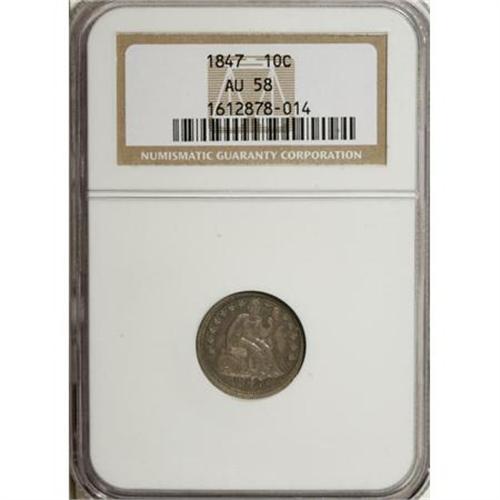 <B>1847 10C AU58 NGC.</B></I> NGC Census: (13/13). PCGS Population (3/15). Mintage: 245,000. Numismedia Wsl. Price for NGC/PCGS coin in AU58: $500. (#4589)<BR><BR><B>Coin Engraver:</B> Christian Gobrecht<BR><BR><b>Shipping:</b> Coins & Currency (<a target="_blank" href="http://www.heritageauctions.com/common/shipping.php">view shipping information</a>)