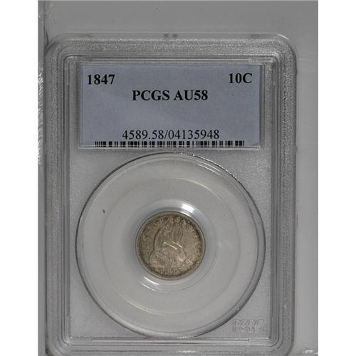 <B>1847<10C> AU58 PCGS.</B></I> Highpoint friction creates only the slightest interruption in the luster of this near-Mint example. A sharply struck piece with blue-violet and russet accents over the steel-gray surfaces.
