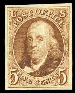 (*) 1847 (1875 Reproduction), 5¢ Red Brown. Without gum as issued. Fresh color, ample margins. Very Fine.