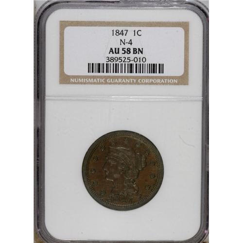 <B>1847 1C AU58 NGC.</B></I> N-4. NGC Census: (44/288). PCGS Population (25/79). Mintage: 6,183,669. Numismedia Wsl. Price for NGC/PCGS coin in AU58: $170. (#1877)<BR><BR><b>Shipping:</b> Coins & Currency (<a target="_blank" href="http://www.heritageauctions.com/common/shipping.php">view shipping information</a>)