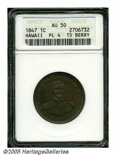 1847 1C Hawaii Cent AU55 ANACS. Plain 4, 15 berri
