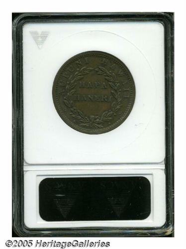 <B>1847<1C> Hawaii Cent AU55 ANACS.</B></I> Plain 4, 15 berries. M. 2CC-6. A sharply struck light brown piece that has generally smooth surfaces. The obverse rim has a series of minor die breaks or 'cuds' near 9 o'clock.