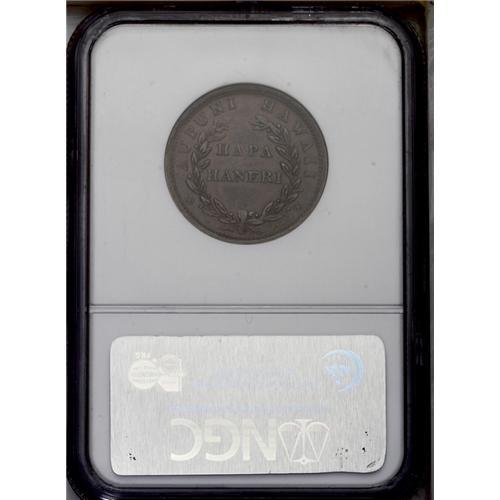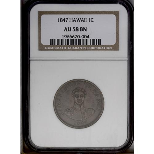 <B>1847<1C> Hawaii Cent AU58 NGC.</B></I> Crosslet 4, 15 berries. M. 2CC-2. Cherry-wood in color, this Hawaiian Cent is not fully brought up in all areas, but detectable marks are refreshingly absent. Satin luster shimmers throughout the legends and devices. <BR><BR><B>Important notice:</B> Heritage usually auctions material at the rate of 200-250 lots per hour. On some occasions eBay Live bid software or the Internet may not be able to keep up with the pace of the auction. We recommend placing a realistic absentee bid now as insurance to avoid disappointment. Occasionally the auctioneer may eliminate or reject an eBay Live bid, and the auctioneer may also reopen a lot after the close of the eBay live bidding (usually because we missed an audience bid), and may reject your bid even if it shows you as the winning bidder. By bidding via eBay Live, you agree that Heritage may award the lot to another bidder at its sole discretion under the circumstances described above or any other reasonable circumstances. Since eBay bids are not shown to us until we open the lot on the floor, we treat those bids just like floor bids. In most cases the floor responds before the eBay bid is presented to us, due to Internet lag time, so for consistency we have made it a policy that floor bids are always considered first over tie eBay live bids. Also please note that all Heritage lots purchased through eBay Live carry a 20% Buyer's Premium. Please make sure you read the Terms and Conditions before you bid. This lot is being auctioned in conjunction with a live floor auction by Heritage Galleries & Auctioneers. All final auction and invoice information will be supplied by Heritage Galleries & Auctioneers, and all other information should be considered preliminary. Lot:5223 <BR><BR><B>Winning Notification and Billing:</B> After the FINAL session in this auction is complete, Heritage will send e-mail and snail mail invoices. This process normally takes several days. All final auction and invoice information will be supplied by Heritage Galleries & Auctioneers, and all other information should be considered preliminary. <BR><BR>This auction will be conducted on a live auction floor and over the Internet through eBay Live. If you choose to place an absentee bid, please take a moment to <font color='#0000ff'><u><a href='http://pages.ebay.com/liveauctions/help/before/laabsentee.html'>learn how eBay Live absentee bidding works</a></u></font><font color='#000000'>