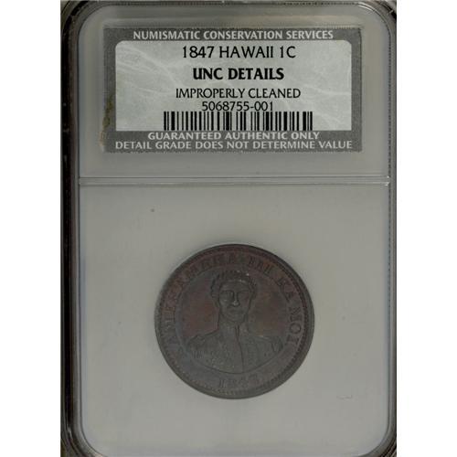1847 1C Hawaii Cent--Improperly Cleaned--NCS. Unc Deta