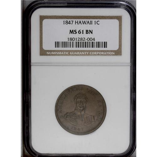 <B>1847<1C> Hawaii Cent MS61 Brown NGC.</B></I> Plain 4, 17 berries. M. 2CC-3. A scarce die marriage. Nicely detailed with delicate violet-brown surfaces. The chin shows some flatness, but the surfaces are largely trouble-free.