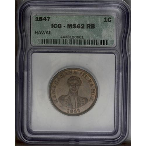 <B>1847<1C> Hawaii Cent MS62 Red and Brown ICG.</B></I> Crosslet 4, 15 berries. M. 2CC-2. A well struck example that is devoid of friction on the King's nose. Generally chocolate-brown in color, although wisps of mahogany patina accompany the wreath.