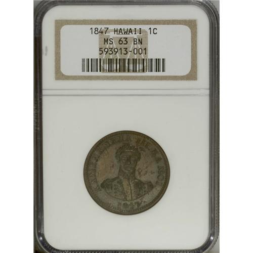 <B>1847 1C Hawaii Cent MS63 Brown NGC.</B></I> Crosslet 4, 15 berries. M. 2CC-2. This solidly struck example has attractive mahogany and violet-brown surfaces. A shallow abrasion is noted between HAPA and HANERI within the wreath on the reverse.<BR><BR><b>Shipping:</b> Coin/Currency (<a target="_blank" href="http://www.heritageauctions.com/common/shipping.php">view shipping information</a>)