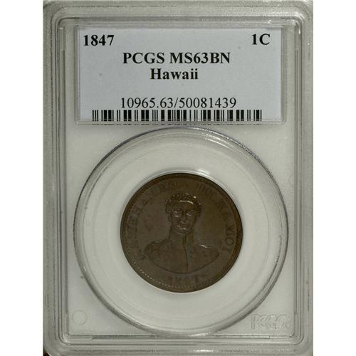1847 1C Hawaii Cent MS63 Brown PCGS. Crosslet 4, 15 be