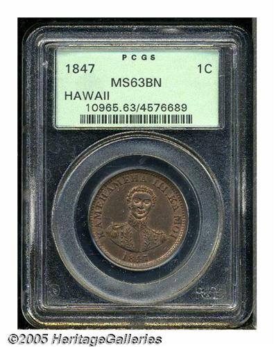<B>1847<1C> Hawaii Cent MS63 Brown PCGS.</B></I> Crosslet 4. M. 2CC-2. Ample faded mint red illuminates the legend. A well struck piece, toned in medium brown color in the fields. A pair of moderate marks are in the left obverse field.