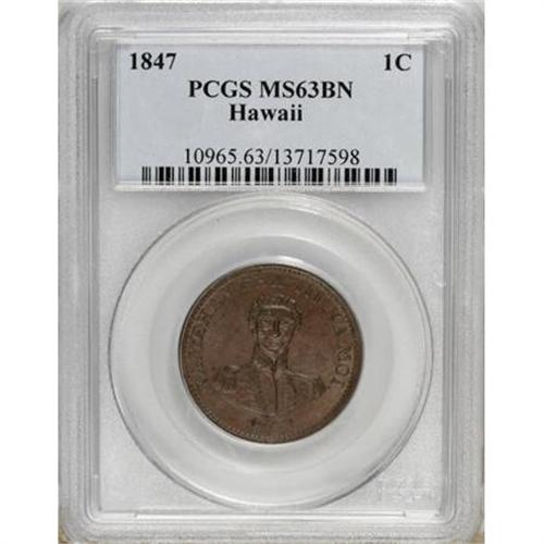 <B>1847 1C Hawaii Cent MS63 Brown PCGS.</B></I> Crosslet 4. 15 berries. M. 2CC-2. A well struck chocolate-brown example that has a few tiny obverse marks and the occasional small and unobtrusive gray spot.<BR><BR><b>Shipping:</b> Coins & Currency (<a target="_blank" href="http://www.heritageauctions.com/common/shipping.php">view shipping information</a>)