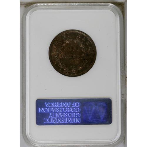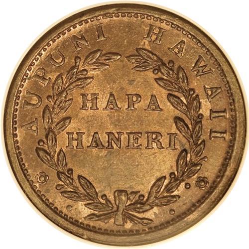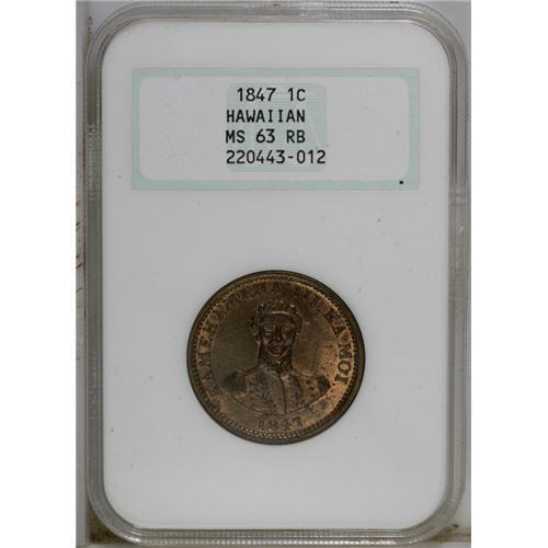 <B>1847<1C> Hawaii Cent MS63 Red and Brown NGC.</B></I> Crosslet 4, 15 Berries. The first of the five official coins issued by the Kingdom of Hawaii and the only one to bear the portrait of King Kamehameha III, the 1847 Hawaiian cent was produced to the extent of only 100,000 pieces. There were, however, a number of privately issued tokens that circulated freely on the islands, owing to the scarcity of small change. This 1847 cent offers much original mint red still in evidence on both sides, complementing the lustrous light brown surfaces seen elsewhere. This well-struck piece is encapsulated in an old-style NGC holder. Population: 56 in 63 Red and Brown, 18 finer (9/06).