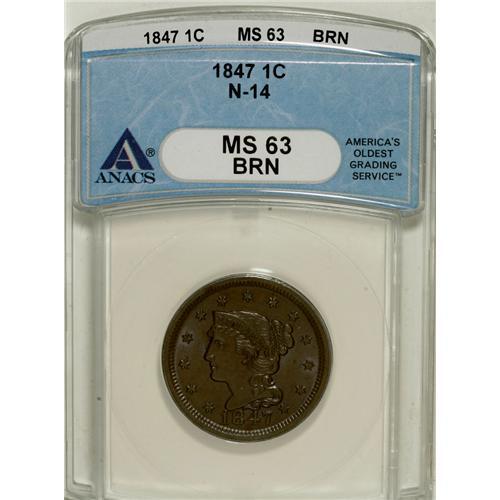 <B>1847 1C MS63 Brown ANACS.</B></I> N-14. NGC Census: (112/300). PCGS Population (32/34). Mintage: 6,183,669. Numismedia Wsl. Price for NGC/PCGS coin in MS63: $276. (#1877)<BR><BR><b>Shipping:</b> Coins & Currency (<a target="_blank" href="http://www.heritageauctions.com/common/shipping.php">view shipping information</a>)