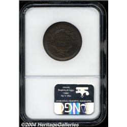 <B>1847<1C> MS64 Brown NGC.</B></I> N-11, Low R.4. A well struck and medium brown near-Gem with a pair of tiny spots on the upper left obverse field and a hint of granularity near RIC in AMERICA. Unabraded aside from a mark on the obverse rim at 6 o'clock. NGC N-11 Population: 2 in 64, none finer (4/04). <BR><BR><B>Important notice:</B> Heritage usually auctions material at the rate of 200-250 lots per hour. On some occasions eBay Live bid software or the Internet may not be able to keep up with the pace of the auction. We recommend placing a realistic absentee bid now as insurance to avoid disappointment. Occasionally the auctioneer may eliminate or reject an eBay Live bid, and the auctioneer may also reopen a lot after the close of the eBay live bidding (usually because we missed an audience bid), and may reject your bid even if it shows you as the winning bidder. By bidding via eBay Live, you agree that Heritage may award the lot to another bidder at its sole discretion under the circumstances described above or any other reasonable circumstances. Since eBay bids are not shown to us until we open the lot on the floor, we treat those bids just like floor bids. In most cases the floor responds before the eBay bid is presented to us, due to Internet lag time, so for consistency we have made it a policy that floor bids are always considered first over tie eBay live bids. Also please note that all Heritage lots purchased through eBay Live carry a 20% Buyer's Premium. Please make sure you read the Terms and Conditions before you bid.
