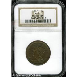 <B>1847 1C MS65 Brown NGC.</B></I> N-1, R.2. Die State C. The bases of the dates are widely repunched west on this crisply struck and lustrous Gem. Medium honey and lilac hues grace both sides. A faint pinscratch on the neck, otherwise essentially pristine. NGC N-1 Population: 1 in 65 Brown, 2 finer (1/05). Lot:5151