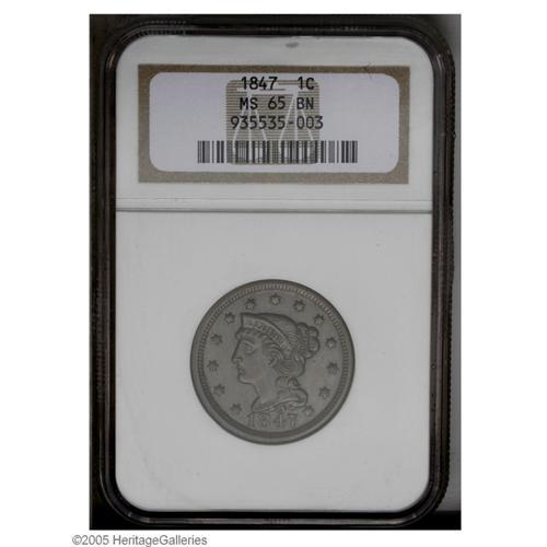 <B>1847<1C> MS65 Brown NGC.</B></I> N-16, R.1. Clash marks (as struck) in front of the chin and lower neck of Liberty identify the Newcomb variety. This handsome golden-brown Gem is crisply struck save for a few upper right stars. The preservation is exemplary, with ticks on the bust truncation and above the N in CENT barely worthy of mention.