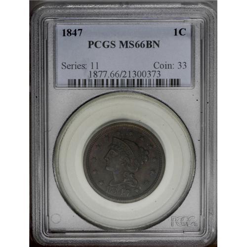 <B>1847<1C> MS66 Brown PCGS.</B></I> N-14, R.4+. Die State b. Dark olive and steel color with faded mint red on both sides. The reverse is lightly cracked through parts of UNITED STATES OF. Dull lines are visible from the dentils left of star 1. This is a very scarce variety, and the present example just misses the Condition Census. EAC 60. <BR><BR><B>Important notice:</B> Heritage usually auctions material at the rate of 200-250 lots per hour. On some occasions eBay Live bid software or the Internet may not be able to keep up with the pace of the auction. We recommend placing a realistic absentee bid now as insurance to avoid disappointment. Occasionally the auctioneer may eliminate or reject an eBay Live bid, and the auctioneer may also reopen a lot after the close of the eBay live bidding (usually because we missed an audience bid), and may reject your bid even if it shows you as the winning bidder. By bidding via eBay Live, you agree that Heritage may award the lot to another bidder at its sole discretion under the circumstances described above or any other reasonable circumstances. Since eBay bids are not shown to us until we open the lot on the floor, we treat those bids just like floor bids. In most cases the floor responds before the eBay bid is presented to us, due to Internet lag time, so for consistency we have made it a policy that floor bids are always considered first over tie eBay live bids. Also please note that all Heritage lots purchased through eBay Live carry a 20% Buyer's Premium. Please make sure you read the Terms and Conditions before you bid. This lot is being auctioned in conjunction with a live floor auction by Heritage Galleries & Auctioneers. All final auction and invoice information will be supplied by Heritage Galleries & Auctioneers, and all other information should be considered preliminary. Lot:312 <BR><BR><B>Winning Notification and Billing:</B> After the FINAL session in this auction is complete, Heritage will send e-mail and snail mail invoices. This process normally takes several days. All final auction and invoice information will be supplied by Heritage Galleries & Auctioneers, and all other information should be considered preliminary. <BR><BR>This auction will be conducted on a live auction floor and over the Internet through eBay Live. If you choose to place an absentee bid, please take a moment to <font color='#0000ff'><u><a href='http://pages.ebay.com/liveauctions/help/before/laabsentee.html'>learn how eBay Live absentee bidding works</a></u></font><font color='#000000'>