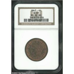 <table><tr><td><TABLE cellSpacing=0 cellPadding=0 width="100%" bgColor=#000000 border=0><TBODY> <TR><TD width="100%"><TABLE cellSpacing=1 cellPadding=3 width="100%" border=0><TBODY><TR><TD width="100%" bgColor=#79735c><FONT face=arial color=#ffffff size=3><B>Description</B> </FONT></TD></TR><TR><TD width="100%" bgColor=#ffffff><FONT face=arial size=2><B>1847 1C MS66 Red and Brown NGC.</B></I> N-39, Low R.3. Faint die cracks on UNITED and AMERICA confirm this scarcer die marriage. This well preserved Gem has an above average strike and is nearly free from carbon. Crimson color outlines the stars and devices, while the fields have chocolate-brown patina. NGC has certified seven Cents as N-39, with two as MS66 Red and Brown and none finer. </FONT></TD></TR></TBODY></TABLE></TD></TR></TBODY></TABLE><BR><A name=PricesRealized></A><TABLE cellSpacing=0 cellPadding=0 width="100%" bgColor=#000000 border=0><TBODY><TR><TD width="100%"><TABLE cellSpacing=1 cellPadding=3 width="100%" border=0><TBODY><TR><TD width="100%" bgColor=#79735c><A name=PR><FONT face=arial color=#ffffff size=3><B>Previous Prices from Heritage Auctions</B> </FONT></A></TD></TR><TR><TD bgColor=#f6f6ed><TABLE cellSpacing=0 cellPadding=0 width="100%" border=1><TBODY><TR><TD align=middle width="33%"><B>Date</B></TD><TD align=middle width="33%"><B>Service</B></TD><TD align=middle width="33%"><B>Price</B></TD></TR><TR bgColor=whitesmoke><TD width="33%"><B>03/18/2003</B></TD><TD width="33%">NGC</TD><TD width="33%">$1,782.50</TD></TR></TBODY></TABLE></TD></TR><TR><TD bgColor=#ffffff><FONT face=arial size=1 ?>PLEASE NOTE: All prices realized reflect the final hammer price PLUS the buyer's premium in auctions that charge a buyer's premium. Each item has a notation at the top of the listing indicating whether that lot included a buyer's premium. Example: A item that sells with a final hammer price of $100 and a 20% buyer's premium will display with a price realized of $120. All information listed is intended to be as accurate as possible, but errors are possible. Please use this guide carefully and inform us of any inaccuracies. </FONT></TD></TR></TBODY></TABLE></TD></TR></TBODY></TABLE><BR><TABLE cellSpacing=0 cellPadding=0 width="100%" bgColor=#000000 border=0><TBODY><TR><TD width="100%"><TABLE cellSpacing=1 cellPadding=3 width="100%" border=0><TBODY><TR><TD width="100%" bgColor=#79735c colSpan=6><FONT face=arial color=#ffffff size=3><B>Price Guide*</B> </FONT></TD></TR><TR bgColor=#f6f6ed><TD align=middle><B>Grade</B> </TD><TD align=middle><B>Coin World<BR>(Trends)</B> </TD><TD align=middle><B>Numismedia<BR>Retail</B> </TD><TD align=middle><B>Numismedia<BR>Wholesale</B> </TD><TD align=middle><B>Coin<BR>Universe</B> </TD><TD align=middle><B>Heritage<BR>Value Index</B> </TD></TR><TR bgColor=#ffffff><TD align=middle>65</TD><TD align=right>---</TD><TD align=right>---</TD><TD align=right>$1,265.00</TD><TD align=right>$975.00</TD><TD align=right>$703.50</TD></TR><TR style="FONT-WEIGHT: bold" bgColor=#cccfdd><TD align=middle>66</TD><TD align=right>---</TD><TD align=right>---</TD><TD align=right>$1,850.00</TD><TD align=right>---</TD><TD align=right>---</TD></TR><TR bgColor=#ffffff><TD align=middle>67</TD><TD align=right>---</TD><TD align=right>---</TD><TD align=right>---</TD><TD align=right>---</TD><TD align=right>---</TD></TR><TR bgColor=#ffffff><TD colSpan=6><FONT size=1>*All information listed is intended to be as accurate as possible, but errors are possible. No item may be returned or refused based on this information which is provided as a service to our customers. You should contact each pricing source directly to determine the accuracy of this information. </FONT></TD></TR></TBODY></TABLE></TD></TR></TBODY></TABLE><BR><TABLE cellSpacing=0 cellPadding=0 width="100%" bgColor=#000000 border=0><TBODY><TR><TD width="100%"><TABLE cellSpacing=1 cellPadding=3 width="100%" border=0><TBODY><TR><TD width="100%" bgColor=#79735c><FONT face=arial color=#ffffff size=3><B>Population Guide</B> </FONT></TD></TR><TR bgColor=#ffffff><TD align=middle><!-- Begin Output of Population Grid--><TABLE cellSpacing=0 cellPadding=0 width="100%" border=0><TBODY><TR><TD vAlign=center><TABLE cellSpacing=0 width="100%" border=1 cellsadding="3"><TBODY><TR><TD vAlign=center><TABLE cellSpacing=0 cellPadding=3 width="100%" border=1><TBODY><TR><TD vAlign=center align=middle bgColor=#f0f1e8 colSpan=2 <CENTER><FONT face=Arial size=2><B>PCGS Pop </B></FONT><CENTER></CENTER></TD><TD vAlign=center align=middle bgColor=#f0f1e8 colSpan=2><CENTER><FONT face=Arial size=2><B>NGC Pop</B></CENTER></FONT></TD></TR><TR><TD vAlign=center><FONT face=Arial size=2>(66)</FONT> </TD><TD vAlign=center align=right><FONT face=Arial size=2>0</FONT> </TD><TD vAlign=center><FONT face=Arial size=2>(66)</FONT> </TD><TD vAlign=center align=right><FONT face=Arial size=2>6</FONT> </TD></TR><TR><TD vAlign=center><FONT face=Arial size=2>(>66)</FONT> </TD><TD vAlign=center align=right><FONT face=Arial size=2>0</FONT> </TD><TD vAlign=center><FONT face=Arial size=2>(>66)</FONT> </TD><TD vAlign=center align=right><FONT face=Arial size=2>0</FONT> </TD></TR></TBODY></TABLE></TD></TR></TBODY></TABLE></TD></TR></TBODY></TABLE><!-- End Output of Population Grid--></TD></TR></TBODY></TABLE></TD></TR></TBODY></TABLE><BR><TABLE cellSpacing=0 cellPadding=0 width="100%" bgColor=#000000 border=0><TBODY><TR> Important notice: Heritage usually auctions material at the rate of 200-250 lots per hour. On some occasions eBay Live bid software or the Internet may not be able to keep up with the pace of the auction. We recommend placing a realistic absentee bid now as insurance to avoid disappointment. Occasionally the auctioneer may eliminate or reject an eBay Live bid, and the auctioneer may also reopen a lot after the close of the eBay live bidding (usually because we missed an audience bid), and may reject your bid even if it shows you as the winning bidder. By bidding via eBay Live, you agree that Heritage may award the lot