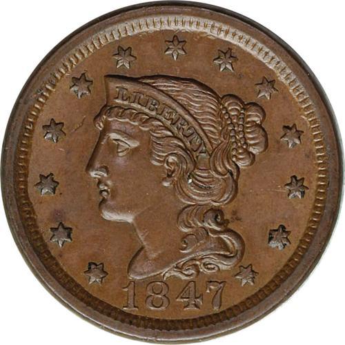 1847 1C N-10, High R.3. MS63 Brown NGC. AU55 EAC. Grel 1847[1C] N-10, High R.3. MS63 Brown NGC. AU55