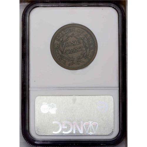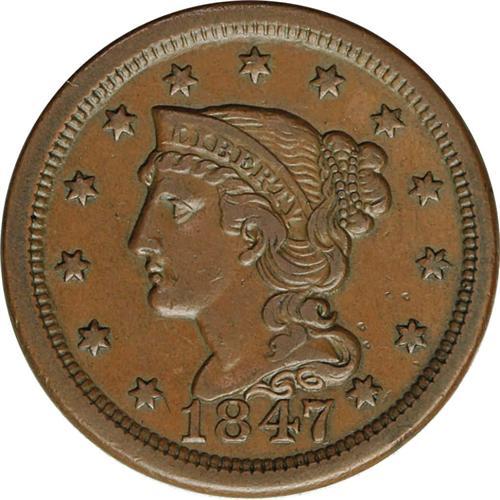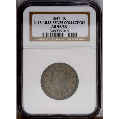 <B>1847<1C> N-15, High R.4. AU55 NGC. VF30 EAC.</B></I> Grellman state a. All examples of this variety are in approximately the same die state. Minor repunching is visible at the base of the 7, and the fine obverse die lines are weak but visible. Medium brown surfaces with minor abrasions and slight verdigris. Envelope Included.