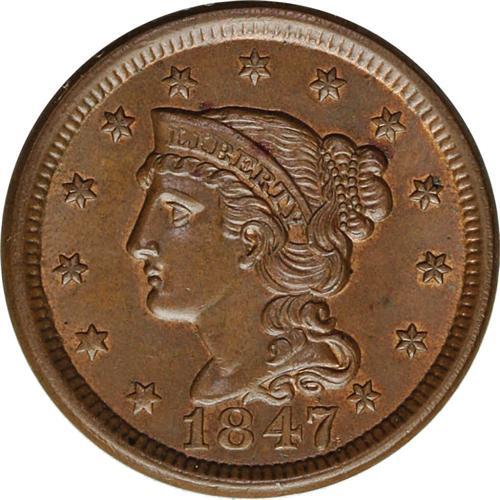 1847 1C N-19, R.1. MS64 Brown NGC. AU55 EAC. Grellman 1847[1C] N-19, R.1. MS64 Brown NGC. AU55 EAC.